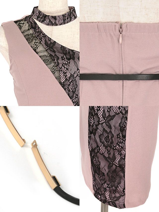 ワンショルダーチョーカーネックアシンメトリーブラックレース切替ウエストベルト付きタイトミニドレスの商品詳細2