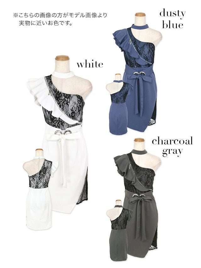 チョーカーフロントジップ胸元フリルウエストリボンアシメワンショルダータイトミニドレスのカラーバリエーション