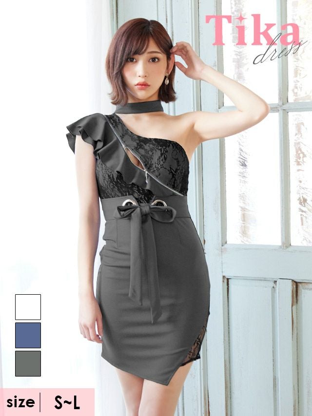 キャバドレス ミニ丈 大きいサイズ キャバクラ クラブ Tika ティカ チョーカー フロントジップ 胸元フリル ウエストリボン アシメ ワンショルダー タイト ミニ ドレス