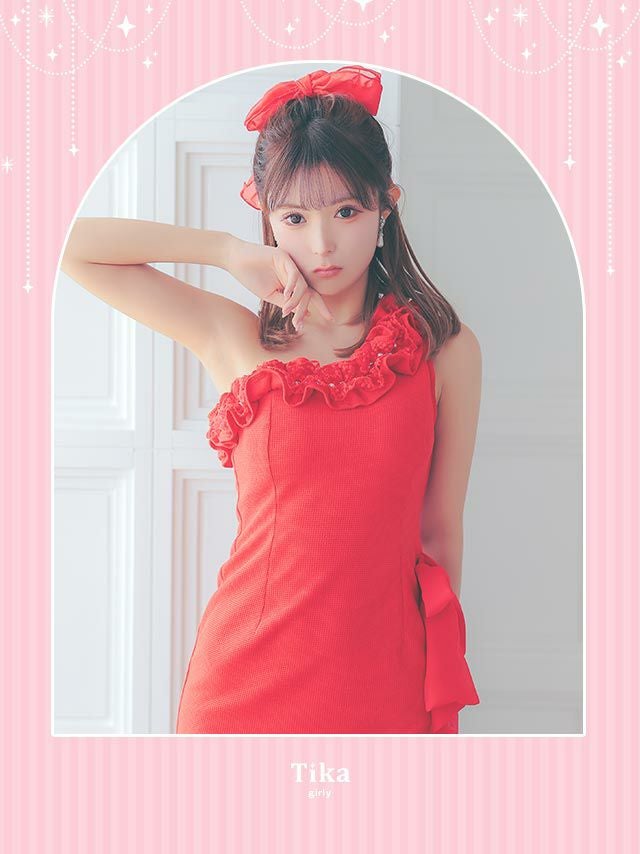女子力爆上げ♪ [SALE] ティアードフリルワンショルダービジューサイドシフォンリボン胸元カバー ワンカラータイトミニドレス (Sサイズ~Lサイズ) (戦慄かなの/キャバドレス着用)
