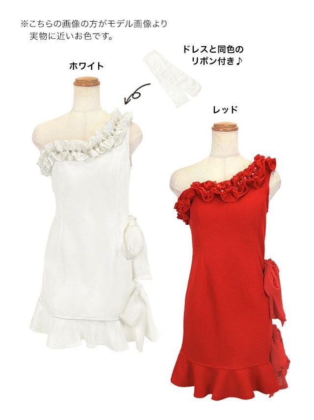 ティアードフリルワンショルダービジューサイドシフォンリボンワンカラータイトミニドレスのカラーバリエーション