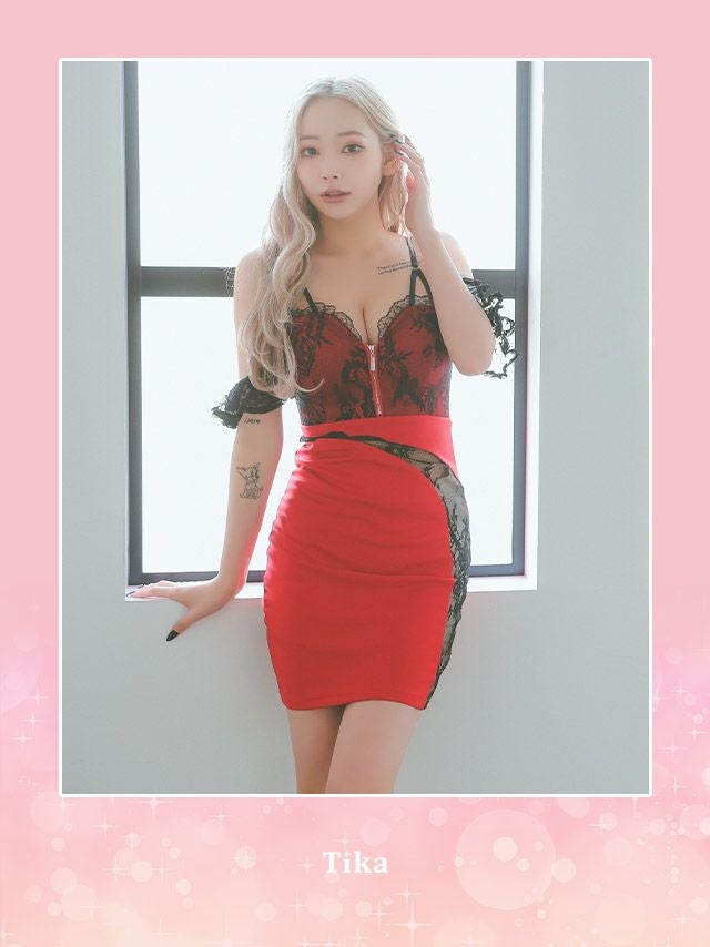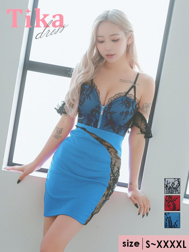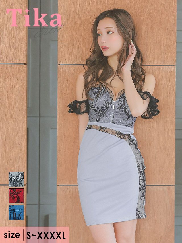 肩あきブラックフラワーレースバストジップ切り替えストレッチタイトミニドレスのカラーバリエーション