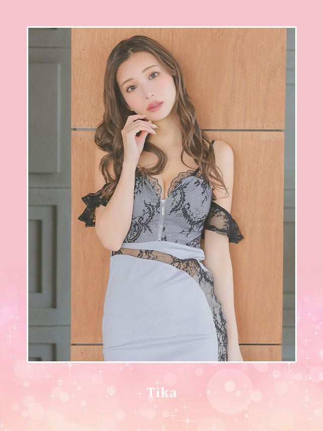肩あきブラックフラワーレースバストジップ切り替えストレッチタイトミニドレスの商品詳細1