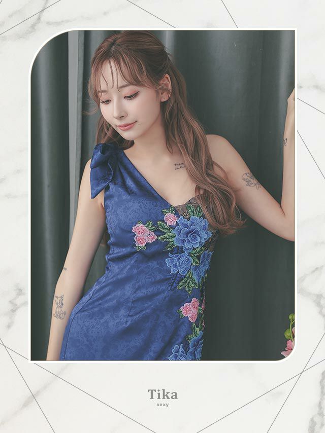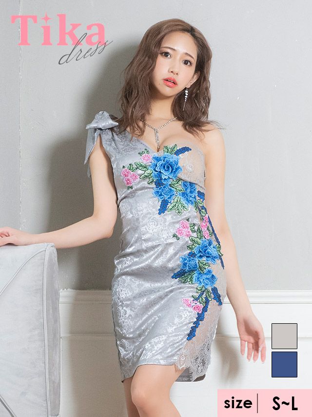 キャバドレス ミニ丈 大きいサイズ キャバクラ クラブ Tika ティカ ワンショルダーリボンエレガントフラワー刺繍レース切り替えファンシージャガードタイトミニドレス