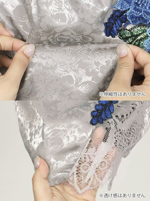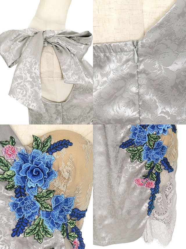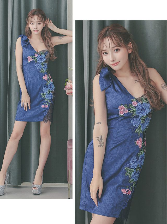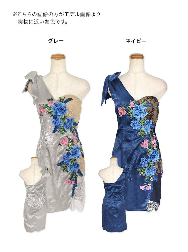 ワンショルダーリボンエレガントフラワー刺繍レース切り替えファンシージャガードタイトミニドレスのカラーバリエーション