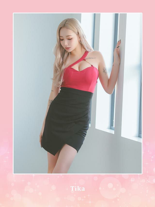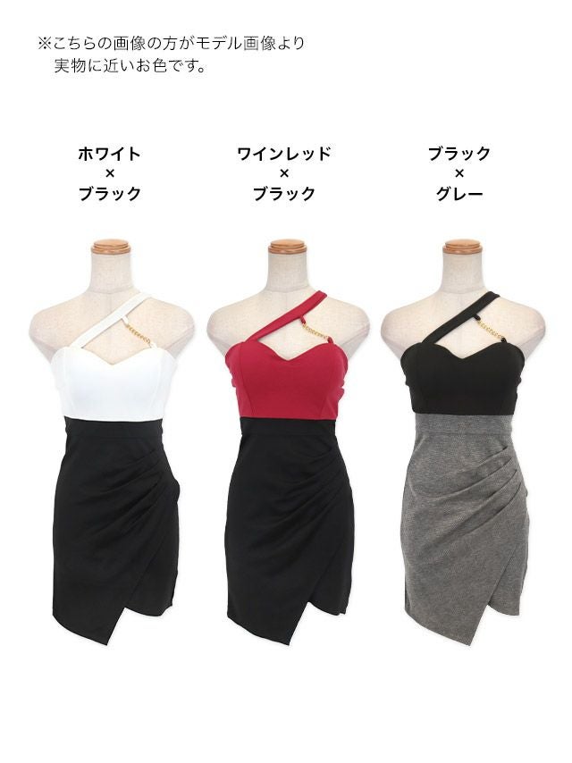 ハートカットゴールドチェーンワンショルダー切り替えバイカラーストレッチアシメラップタイトミニドレスのカラーバリエーション
