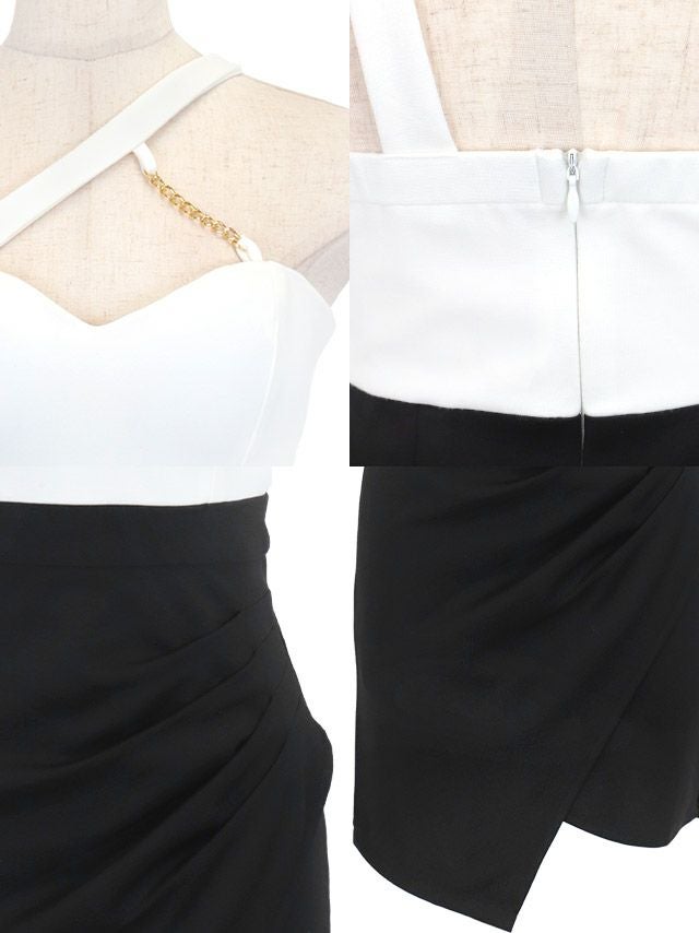 ハートカットゴールドチェーンワンショルダー切り替えバイカラーストレッチアシメラップタイトミニドレスの商品詳細1