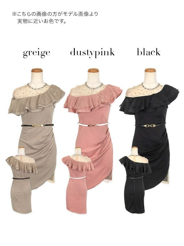 シアーデコルテパールビジューワンショルダー風胸元フリルベルト付きアシメタイトミニドレスのカラーバリエーション