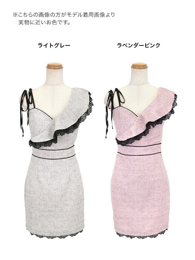ワンショルダー風 ショルダーリボン 大判胸元フリル 縁取りブラックレース ツイード タイトミニドレスのカラーバリエーション