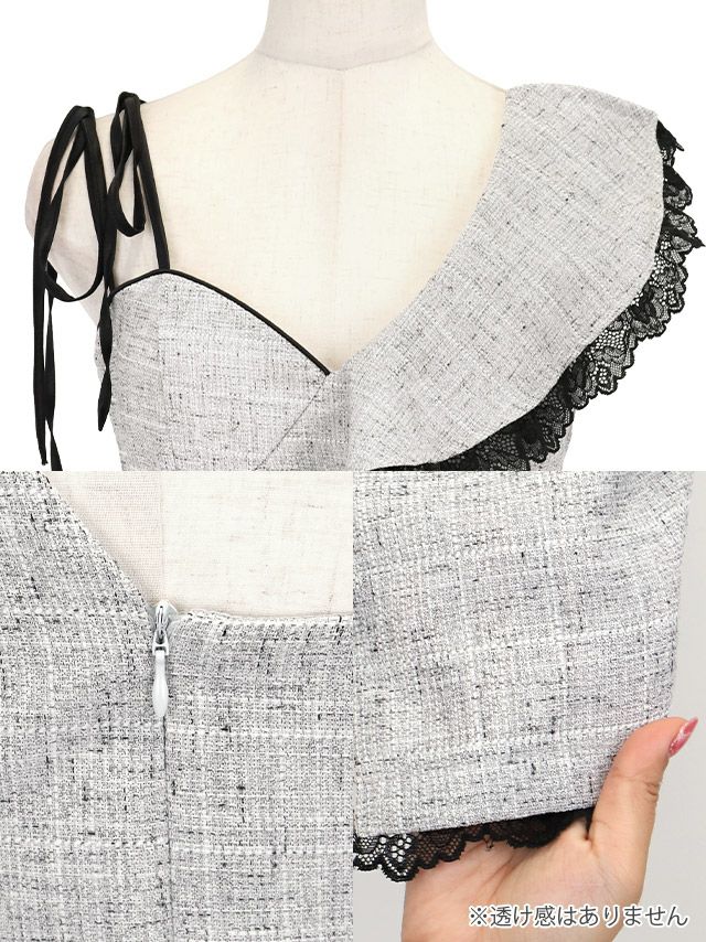 ワンショルダー風 ショルダーリボン 大判胸元フリル 縁取りブラックレース ツイード タイトミニドレスの商品特徴