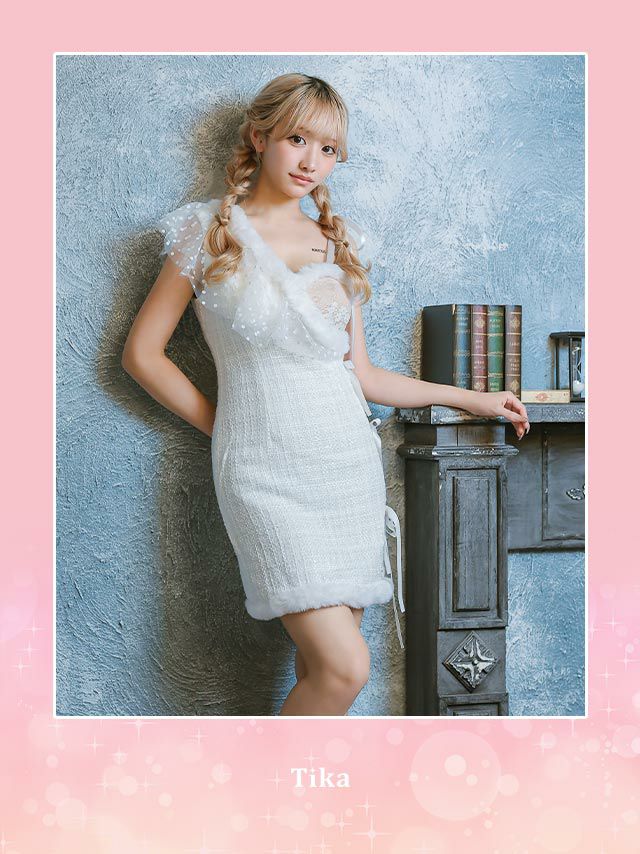 5. ワンショルダードット柄チュール胸元フリルツイードタイトミニドレス (Sサイズ~Lサイズ) (重川茉弥/キャバドレス着用)