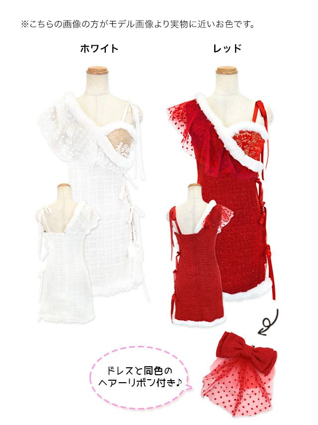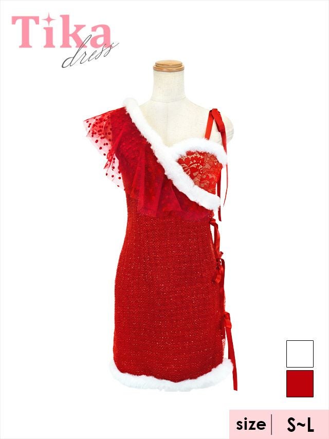 ワンショルダードットチュール胸元フリルクリスマスツイードタイトミニドレスのカラーバリエーション
