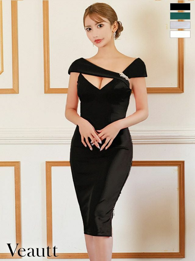 4. SALE [Veautt/ヴュート] 高級デコルテクロスアシンメトリービジューブローチタイト膝丈ドレス
