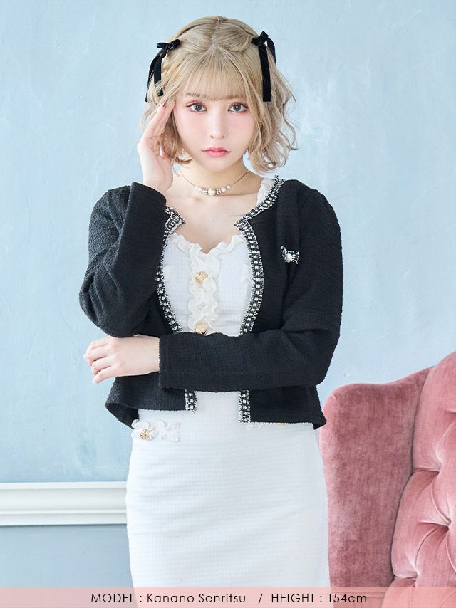 3. ノーカラーツイードボレロカーディガン (久保七瀬/羽織り着用)