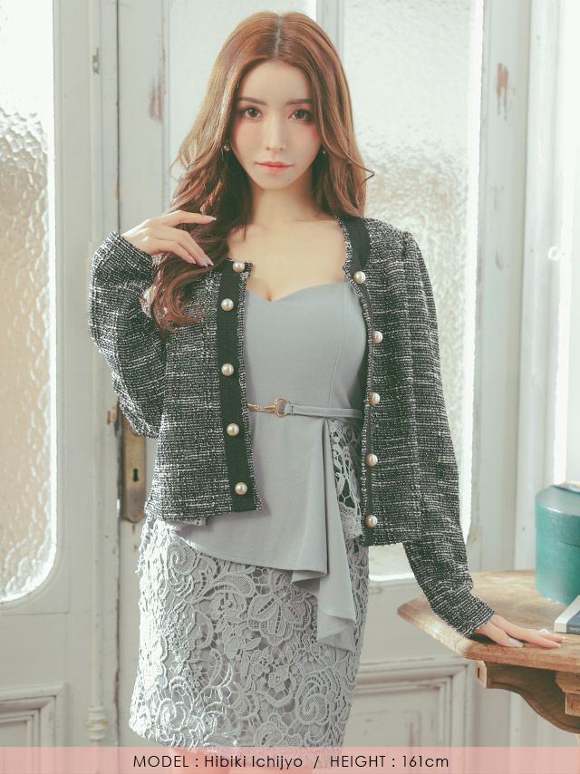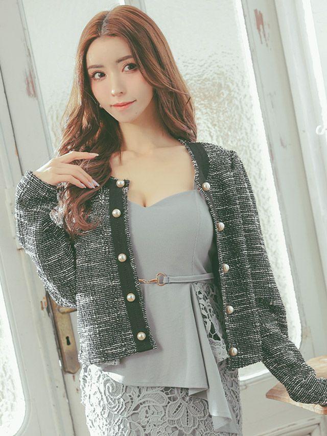 3. 縁取りノーカラーパールニットボレロカーディガン (一条響/羽織り着用)