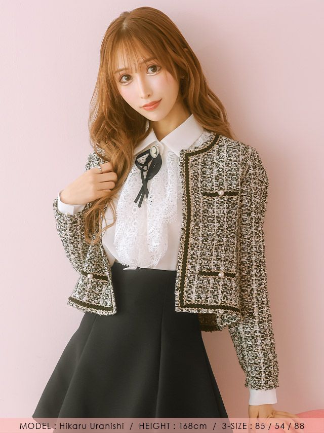 3. ツイード風縁取りボレロカーディガン (浦西ひかる/羽織り着用)