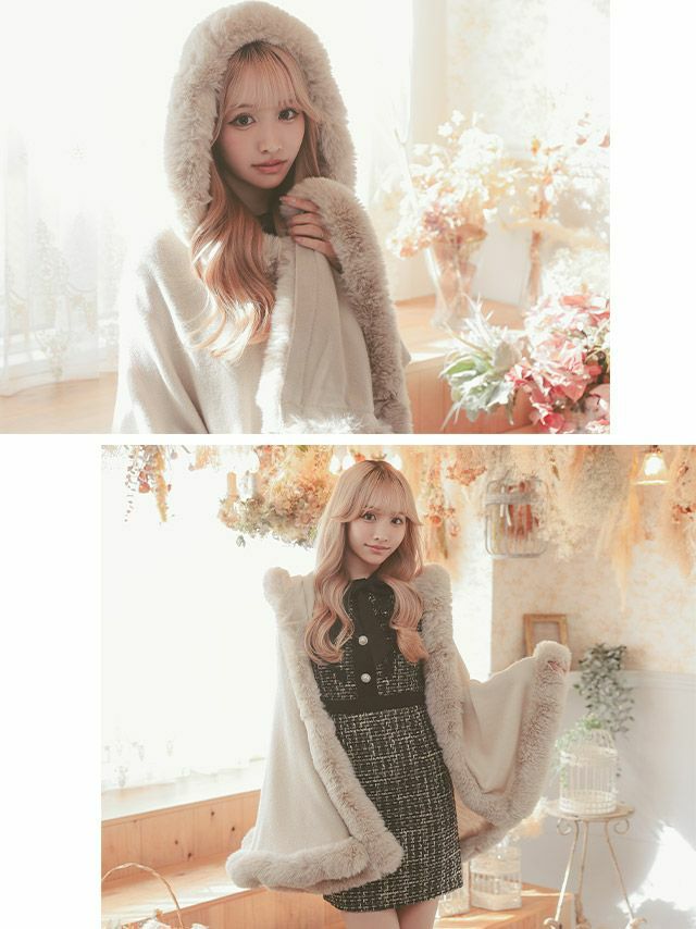 4. [SALE] フェイクファーケープフード付き大判ショール (重川茉弥/羽織り着用)