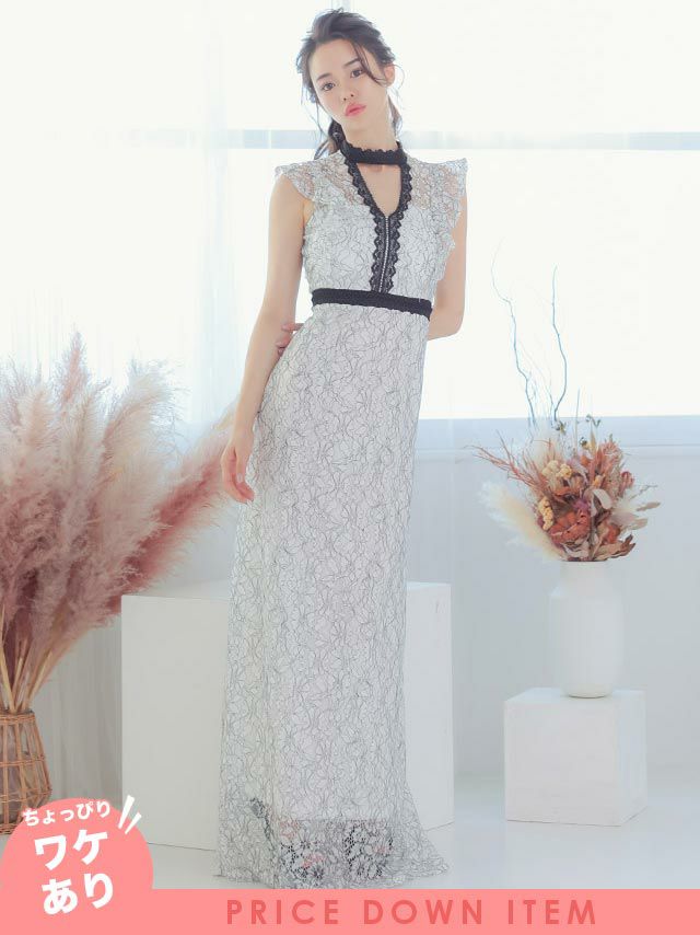 ちょっぴり訳ありの為、激安価格◎ [ワケありセール] オールレースフリル袖ネックデザインデコルテカットノースリーブAラインロングドレス (Sサイズ~XXLサイズ) (るな/キャバドレス着用)