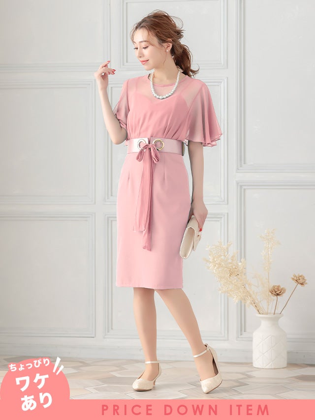 5. [ワケありセール] [パーティードレス] ウエストベルト付きフレアスリーブミディアムシフォンドレス (ピンク/ボルドー/グリーン/ブラック) (Sサイズ/Mサイズ/Lサイズ/XLサイズ)[R classic/アール クラシック]