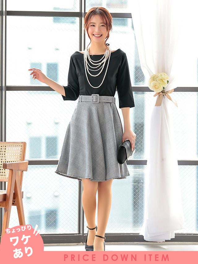 選べる袖丈ボードネックベルト付きグレンチェックフレアミニ結婚式訳ありパーティードレスのメイン画像
