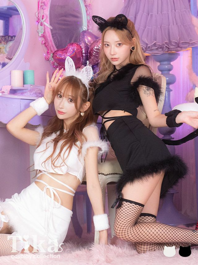 ハロウィンコスプレ 5点set フェザー付きクロスコードセットアップ映え白猫&黒猫セクシー訳ありアニマルのイメージ画像1