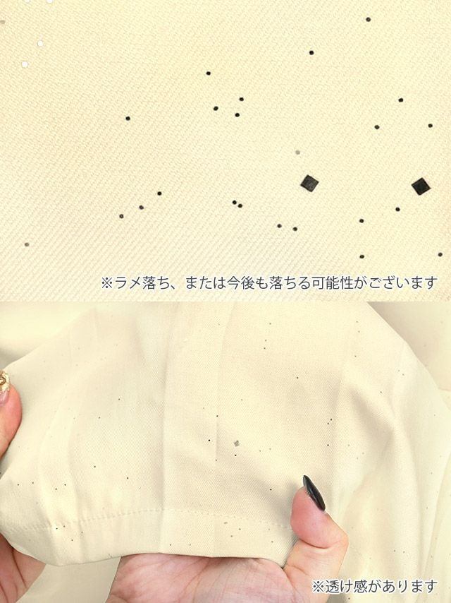 ・ハトメ、スタッズ、ラインストーンなど金属類の装飾は着用時の過度な摩擦で脱落することがありますので注意してください。