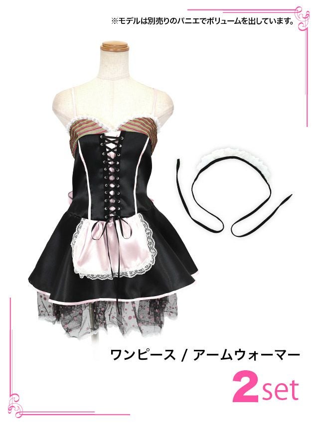 色移りの為、激安価格◎ [ワケありセール] レースアップドットチュールアメリカンインポートセクシーウェイトレス [2点セット] (ワンピース/アームウォーマー)