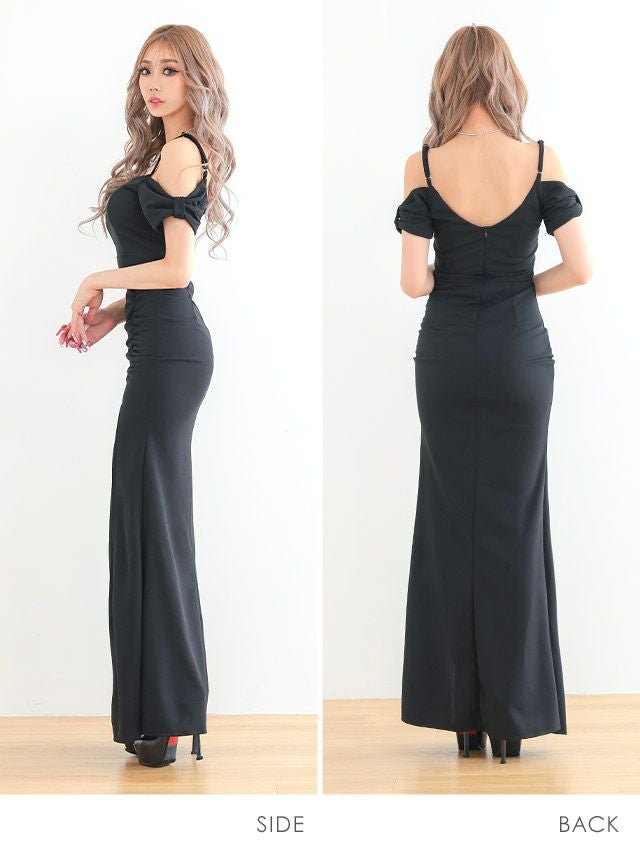 肩あき 袖リボン バスト シースルー ワンカラー サイドスリット マーメイドロングドレスのイメージ画像1