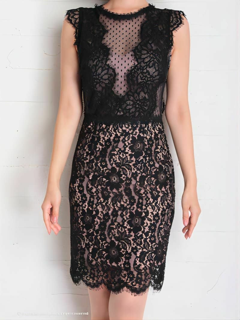 レース×シースルーで大人SEXY☆ SALE [Andy/アンディ] 高級フラワー刺繍レースシースルー切替ノースリーブタイトミニドレス