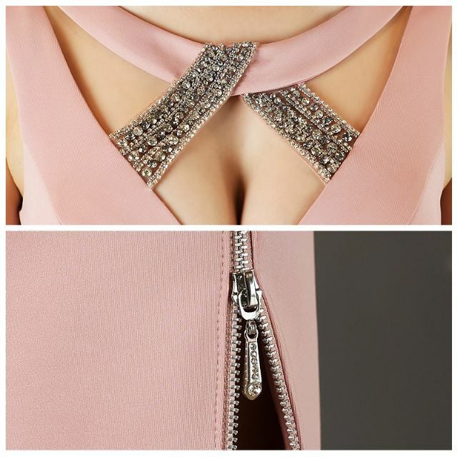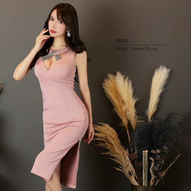 5. SALE [Veautt/ヴュート] 高級 ワンカラー ビジュー クロスデザイン バストカット サイドジップ ノースリーブ タイト 谷間魅せ 膝丈ドレス