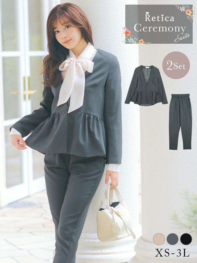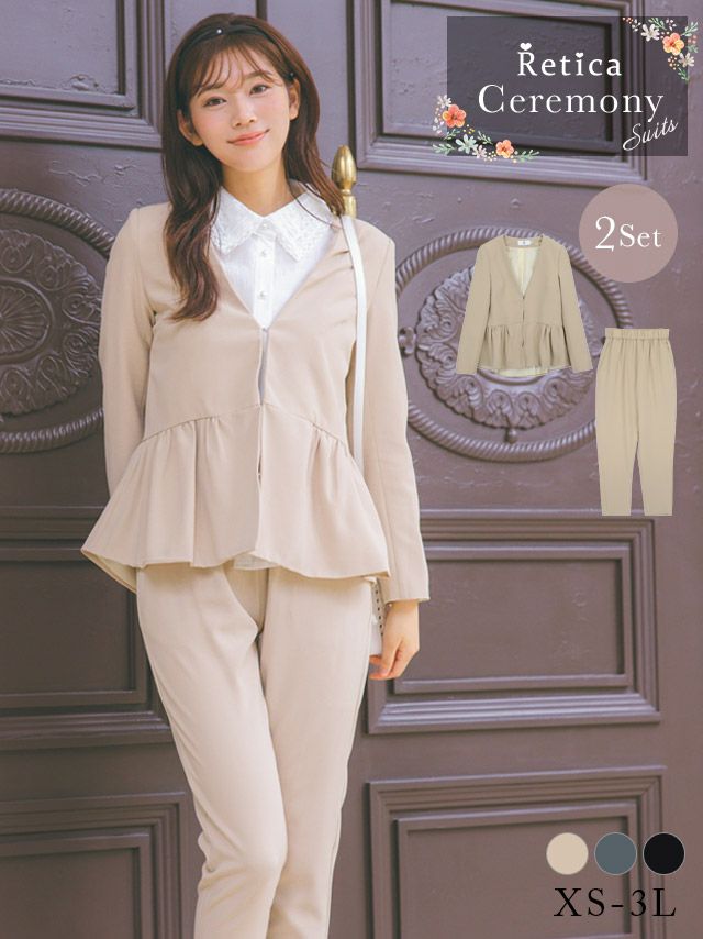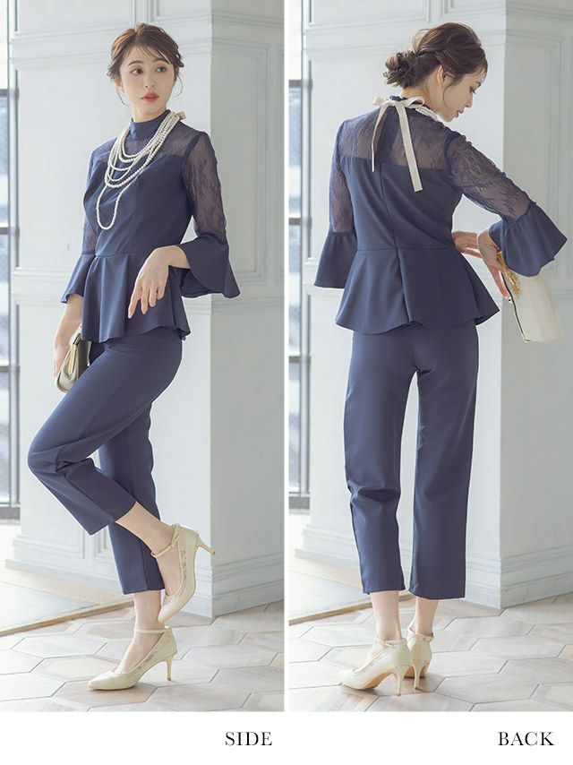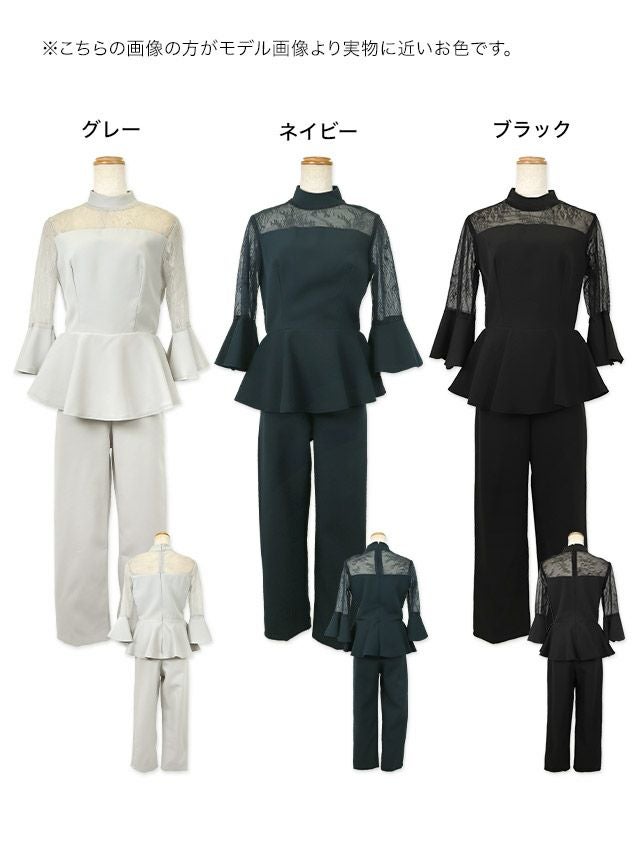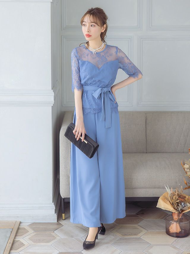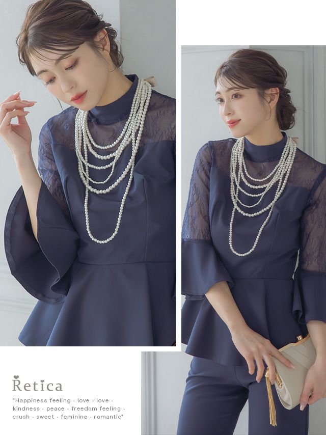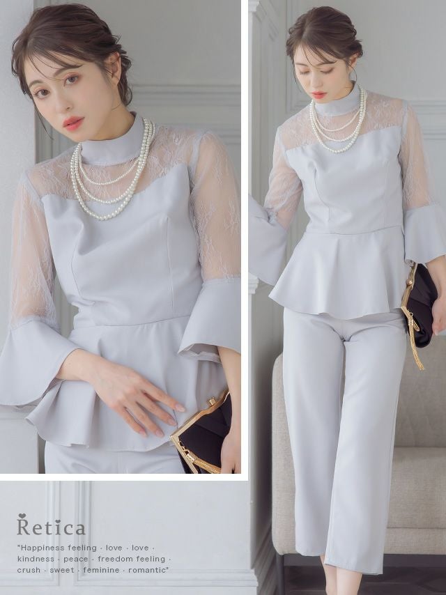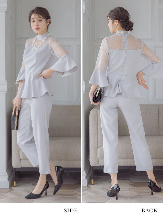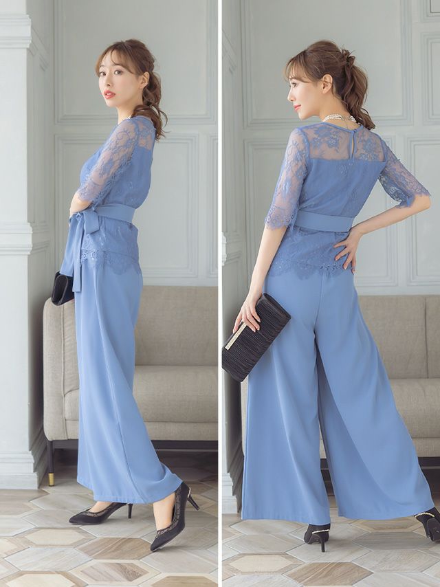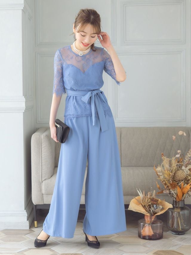 [ワケありセール] (色移りします)シンプル五分袖トップスリングベルト付きワイドパンツツーピースパンツベルスリーブ結婚式パーティードレス [Retica/レティカ]