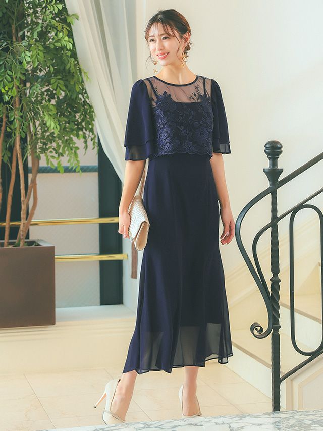 [ワケありセール] シアーフリルフラワーチュールロングスカート七分袖ベルスリーブ結婚式パーティードレス [Retica/レティカ]