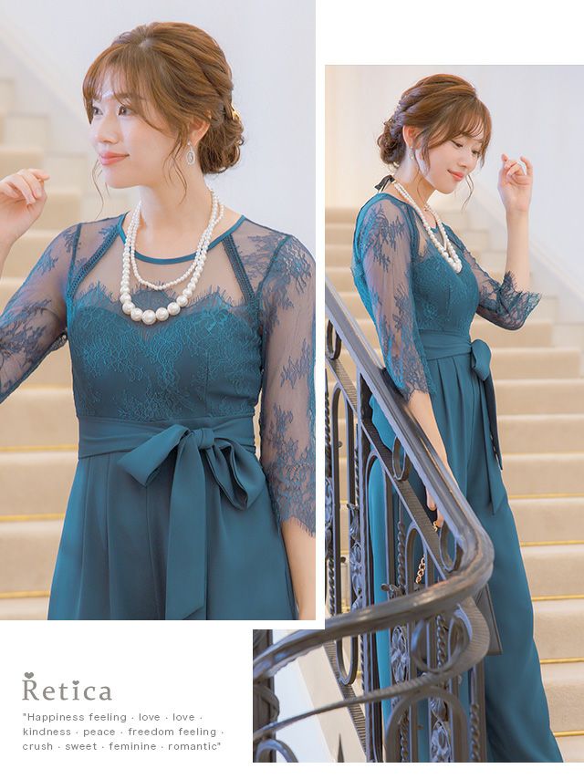 ちょっぴり訳ありの為、激安価格◎(ウエストリボンなし) [ワケありセール] (ウエストリボンなし) 総レースサテン七分袖カジュアルフレア膝下結婚式パーティードレス [Retica/レティカ]
