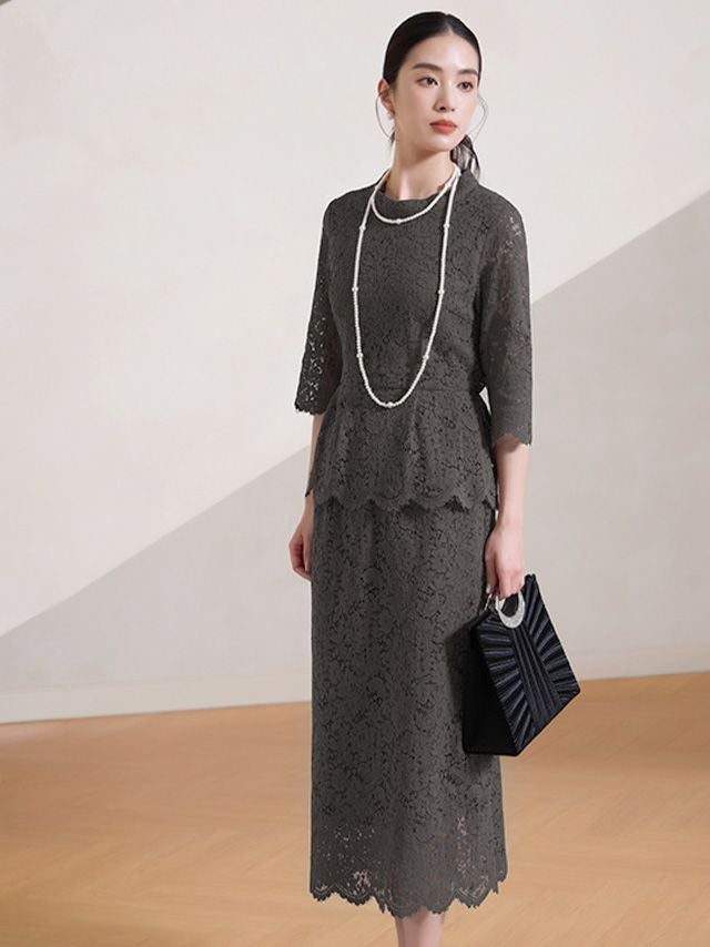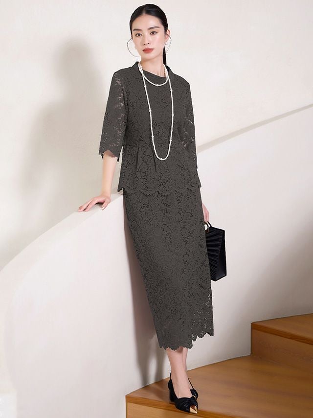総レース5部袖トップス×タイトスカートツーピース結婚式パーティードレスの商品詳細 ディテール1