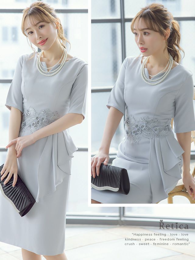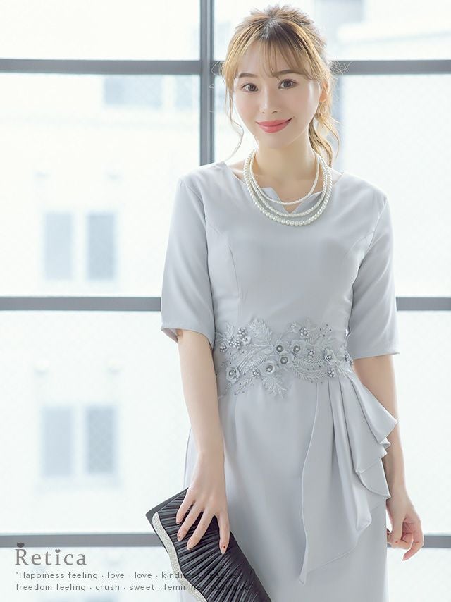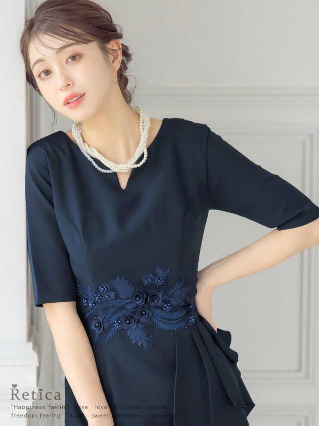 洗練された女性に♪ [SALE] ワンカラー五分袖フラワー刺繍膝下結婚式パーティードレス [Retica/レティカ]