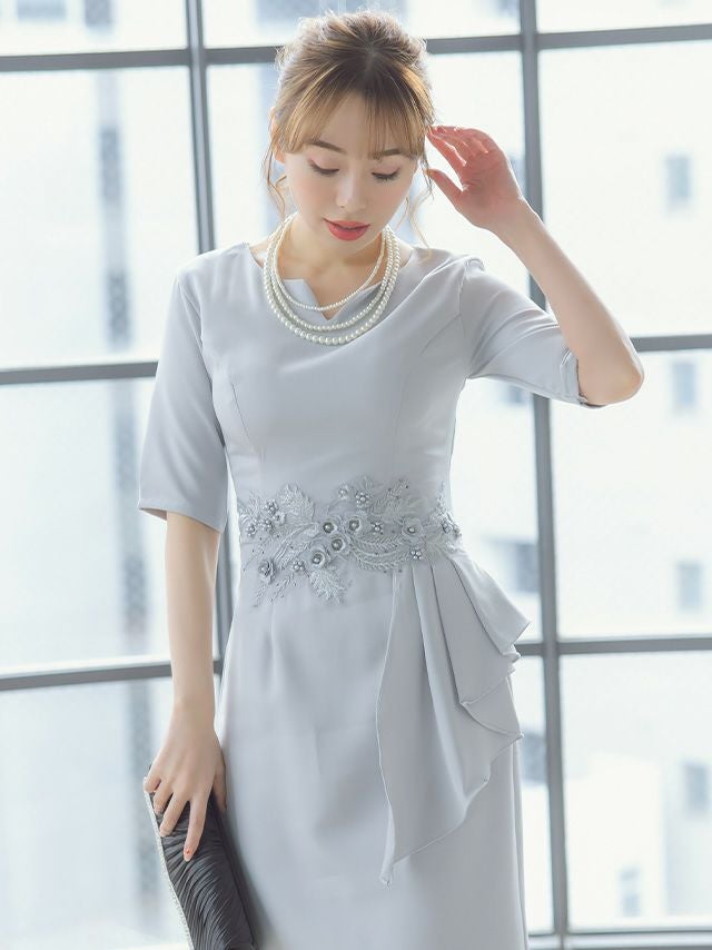 ワンカラーフラワー刺繍ミモレ丈ハーフスリーブ結婚式パーティードレス