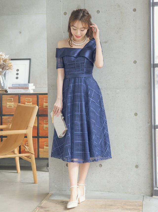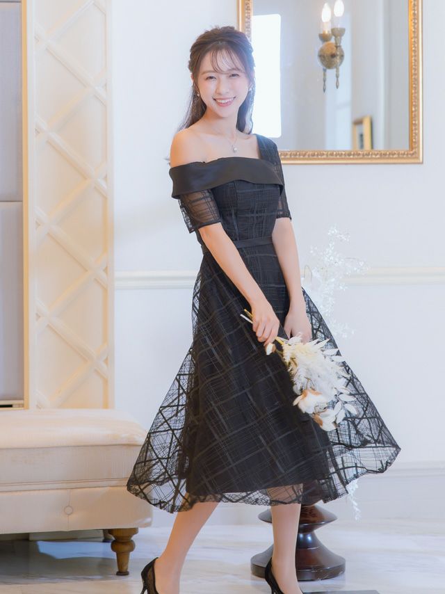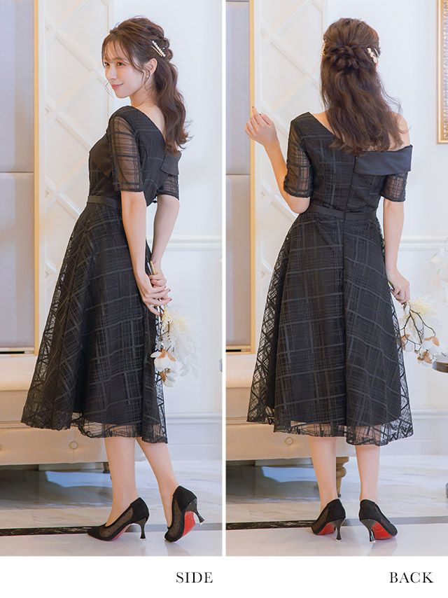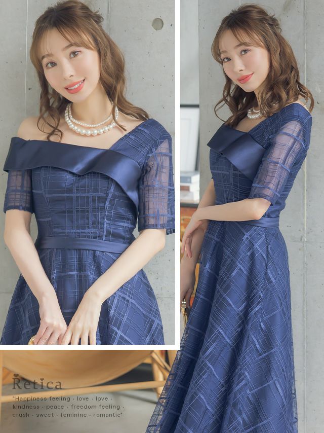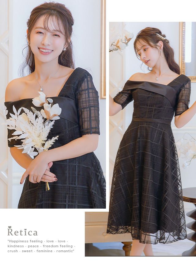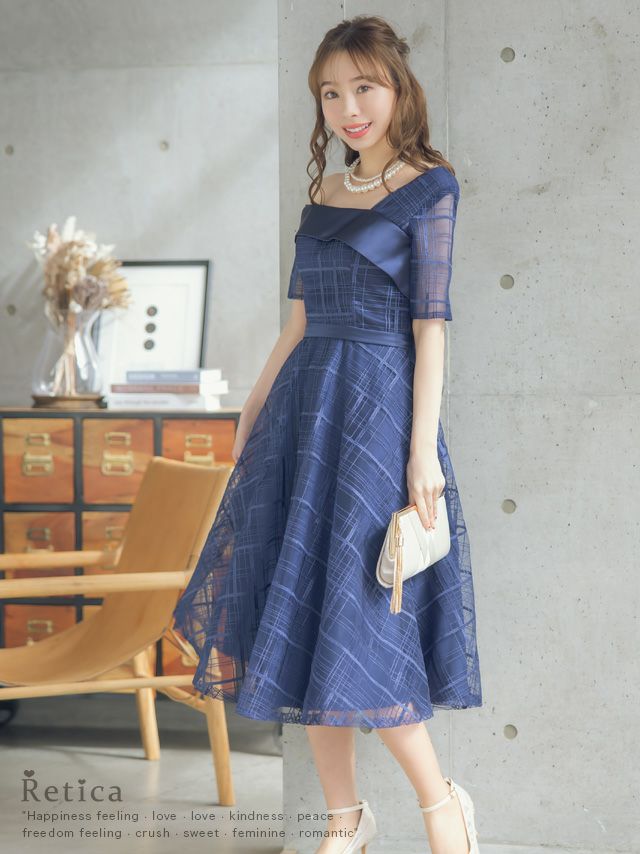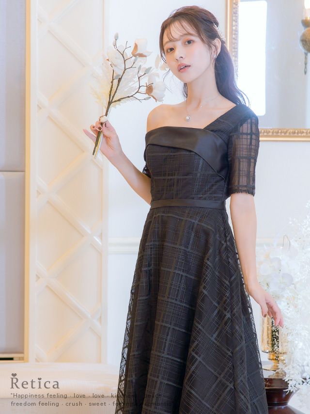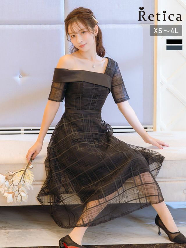 4. [SALE] ワンカラーシースルーチェック五分袖フレア膝下ワンショルダー結婚式パーティードレス [Retica/レティカ]