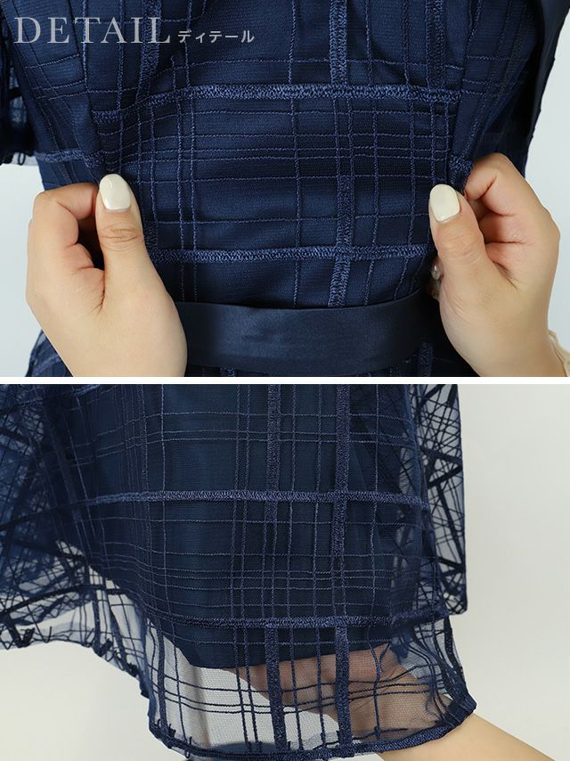 3. [SALE] ワンカラーシースルーチェック五分袖フレア膝下ワンショルダー結婚式パーティードレス [Retica/レティカ]