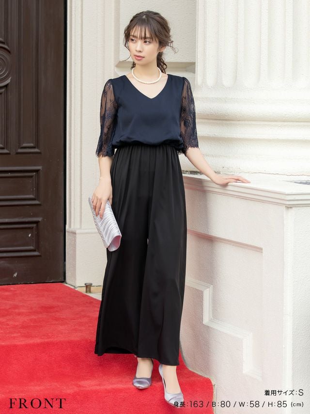 レース五部袖バイカラー結婚式パーティーパンツドレスのフロント画像
