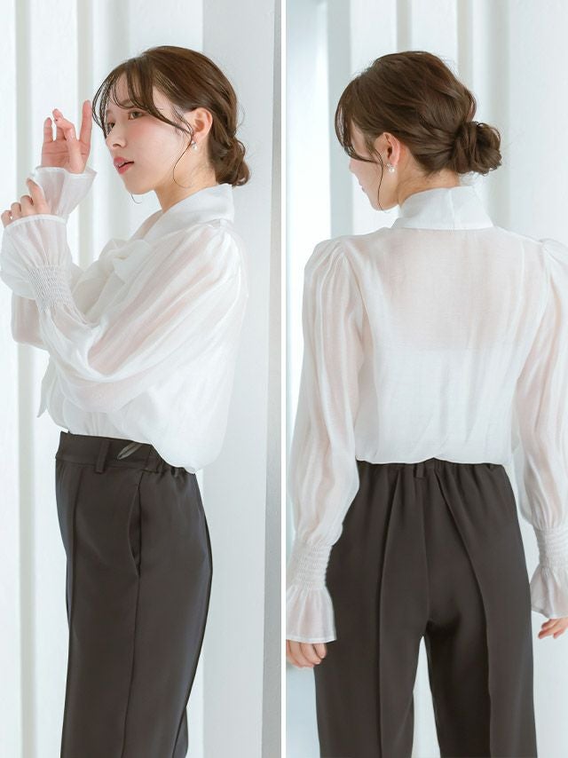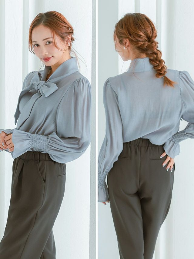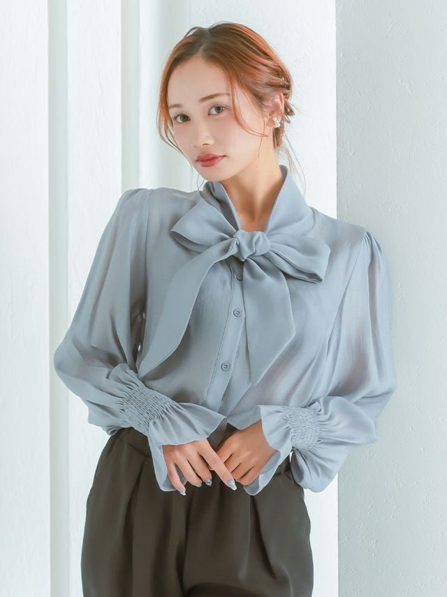 きちんと感と女性らしさを兼ね備えたボウタイブラウス。
