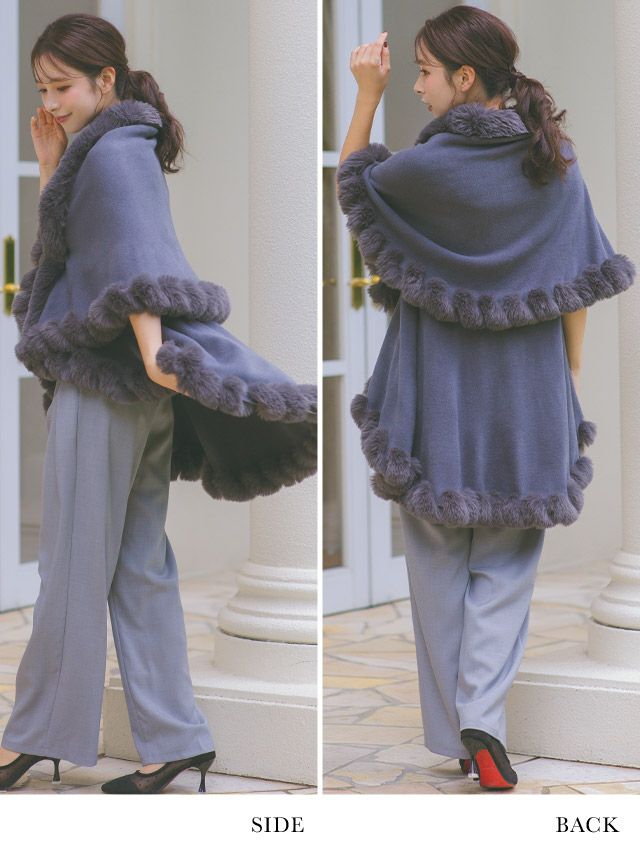 ファー付きソフトニットポンチョ風ロング丈ボレロのメイン画像 ファー付きソフトニットポンチョ風ロング丈ボレロのイメージ画像 ファー付きソフトニットポンチョ風ロング丈ボレロロのフロント ファー付きソフトニットポンチョ風ロング丈ボレロのサイドバック ファー付きソフトニットポンチョ風ロング丈ボレロのカラバリ画像
