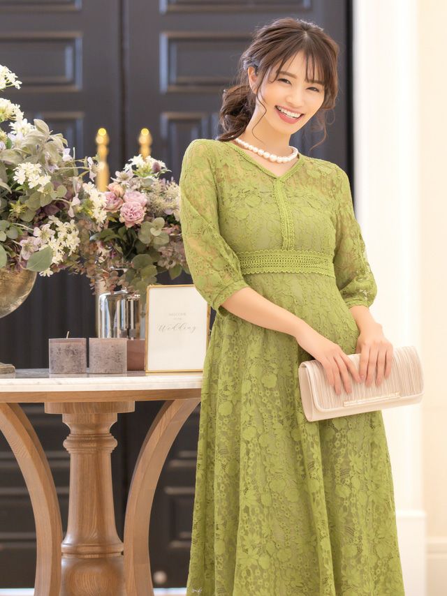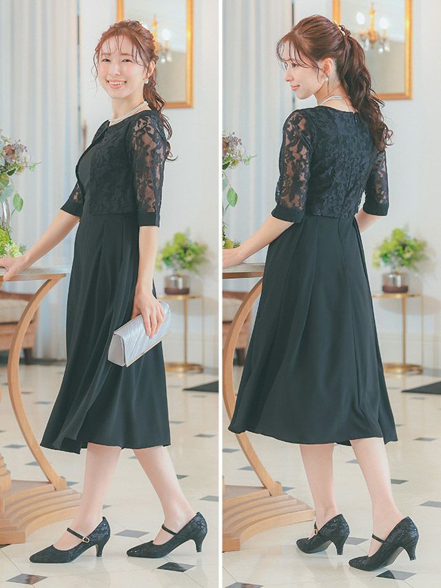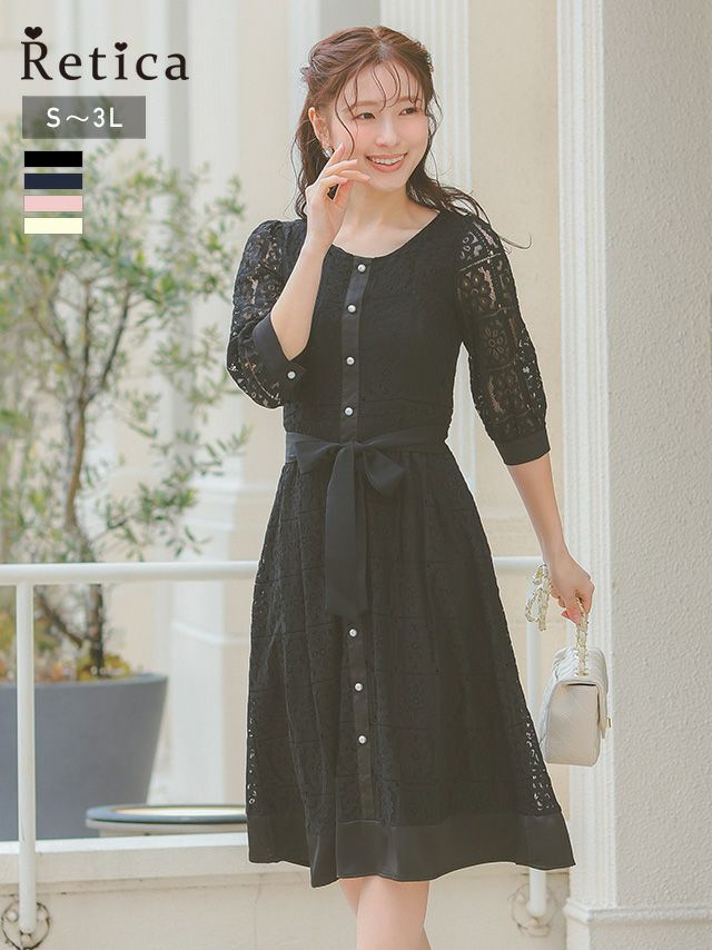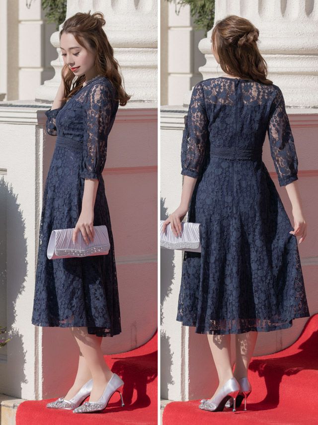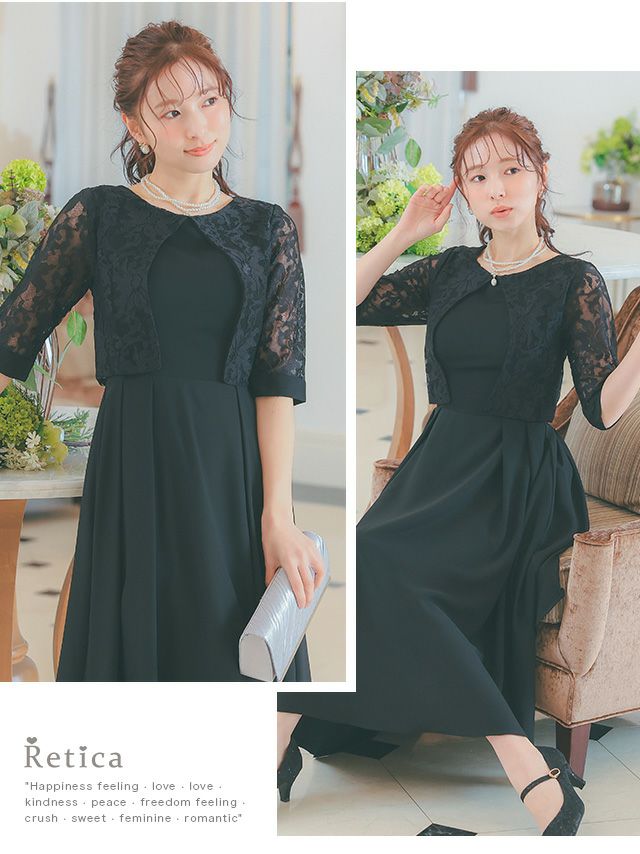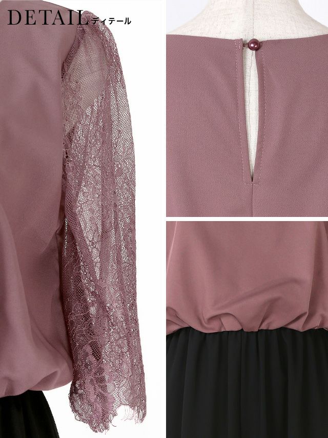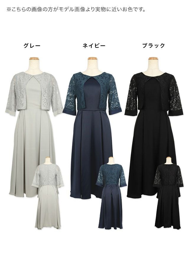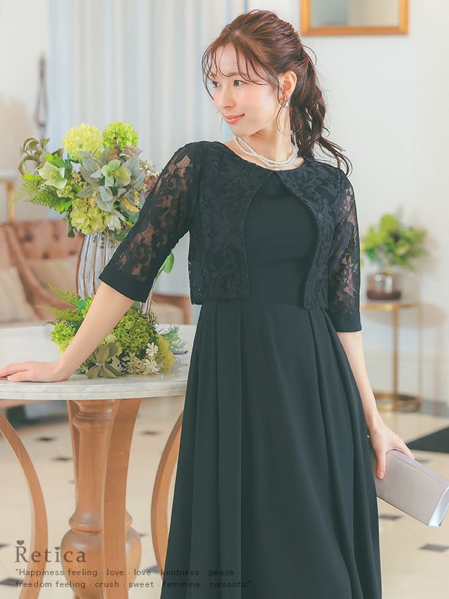 ちょっぴり訳ありの為、激安価格◎ [ワケありセール] レースシフォンプリーツ大人ロングスリークォータースリーブ結婚式パーティードレス [Retica/レティカ]