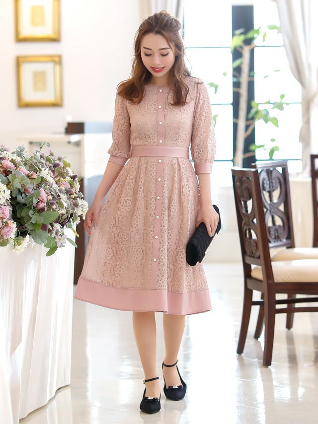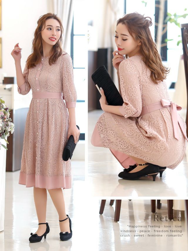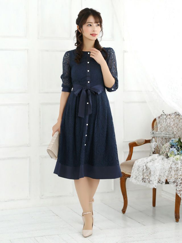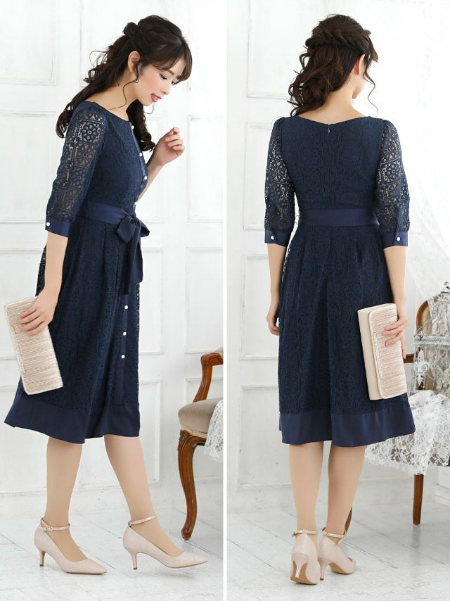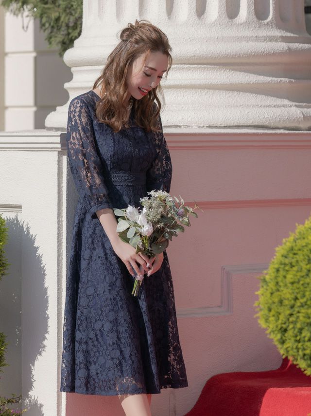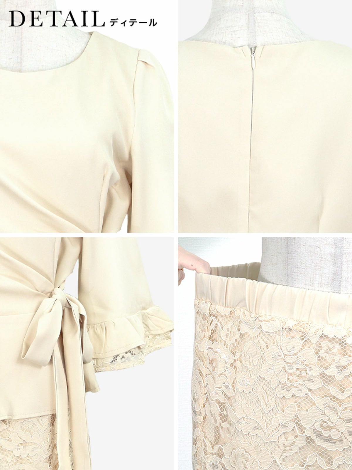 ちょっぴり訳ありの為、激安価格◎ [ワケありセール] レースシフォンプリーツ大人ロングスリークォータースリーブ結婚式パーティードレス [Retica/レティカ]