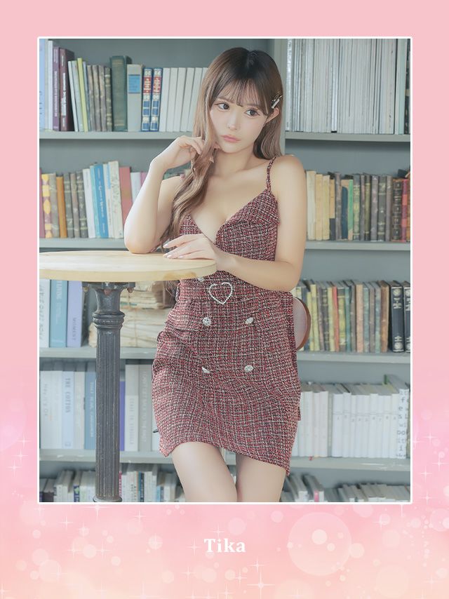 5. [SALE] ハートバックル ウエストベルト付き ツイード キャミソール ダブルボタン ガーリー フレアミニドレス (Sサイズ~Lサイズ) (聖菜/キャバドレス着用)