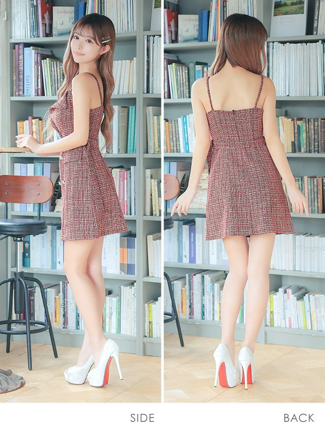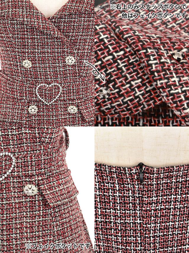 4. [SALE] ハートバックル ウエストベルト付き ツイード キャミソール ダブルボタン ガーリー フレアミニドレス (Sサイズ~Lサイズ) (聖菜/キャバドレス着用)