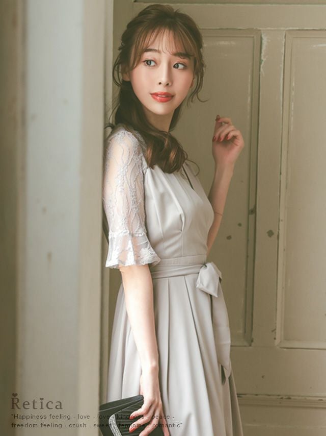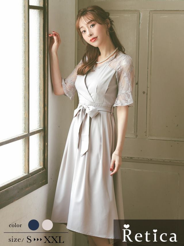 カシュクールデザインウエストリボン膝下レース五分袖ベルスリーブ結婚式パーティードレス [Retica/レティカ]