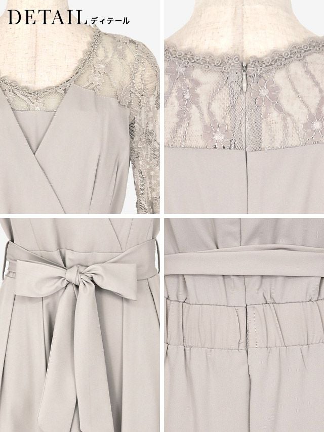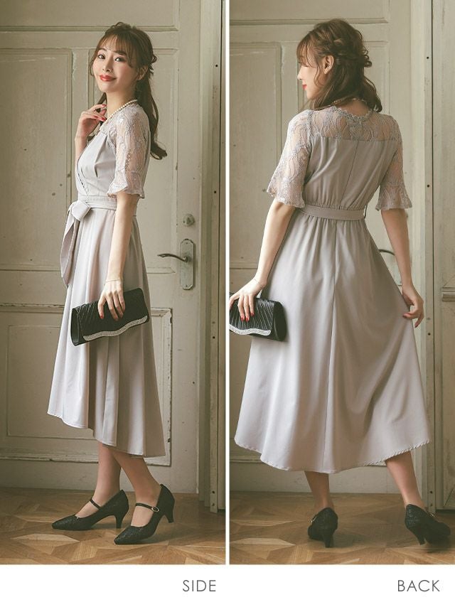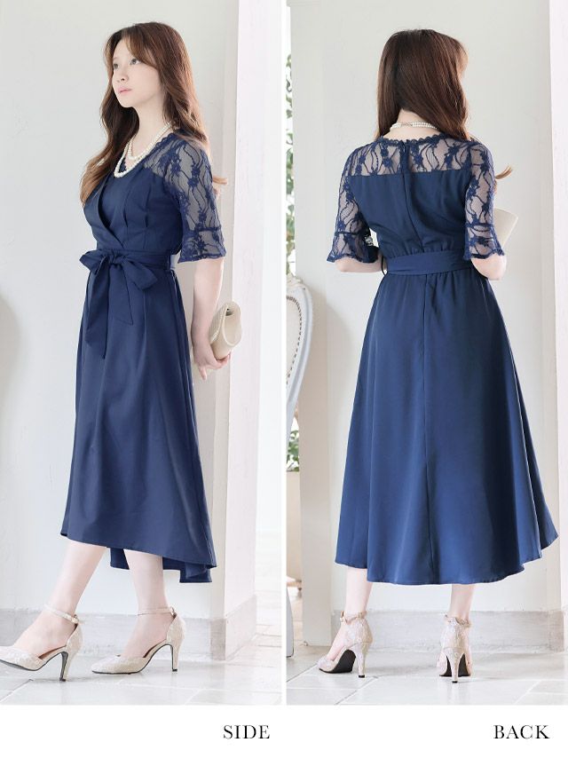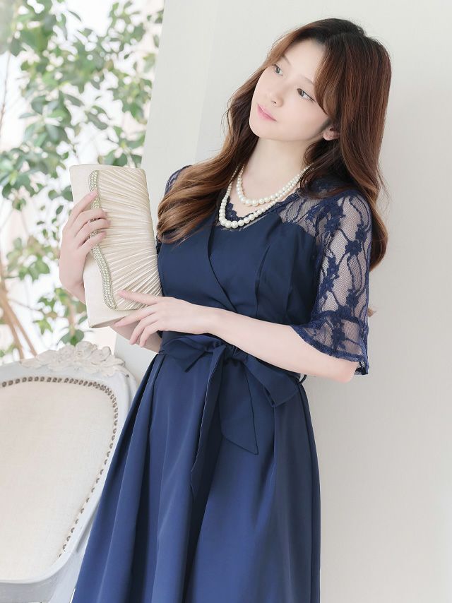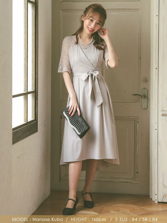 4. カシュクールデザインウエストリボン膝下レース五分袖ベルスリーブ結婚式パーティードレス [Retica/レティカ]