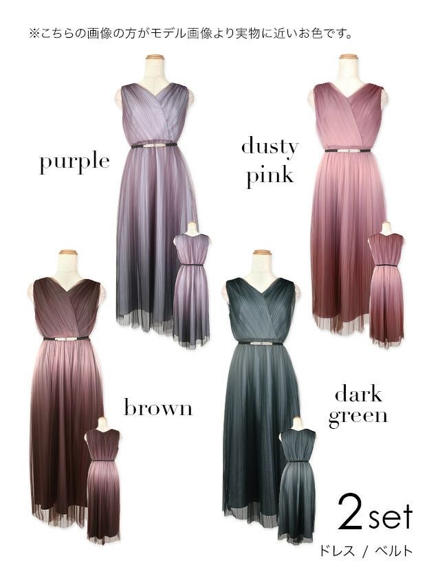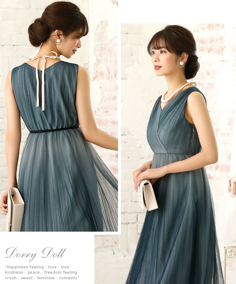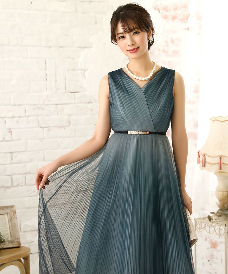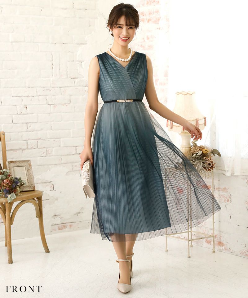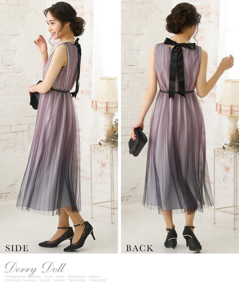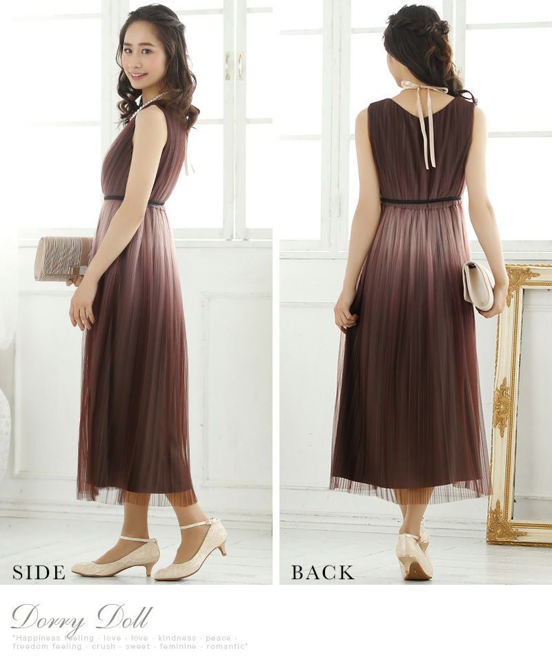 グラデーションカラーベルト付き大人チュールプリーツ肌見せミモレ丈結婚式パーティードレス DorryDoll