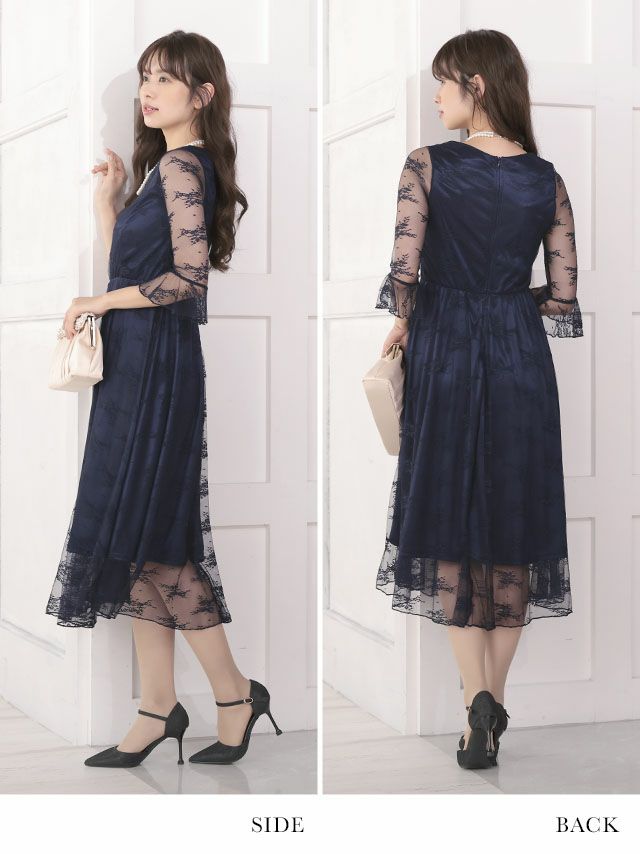 パールネックレス付きフラワーレースミモレ丈ハーフスリーブ結婚式パーティードレスのサイドバック画像