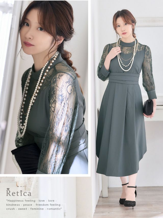 3. バックレースアップデザインアシンメトリーAライン膝下レーススリーブ結婚式パーティードレス [Retica/レティカ]